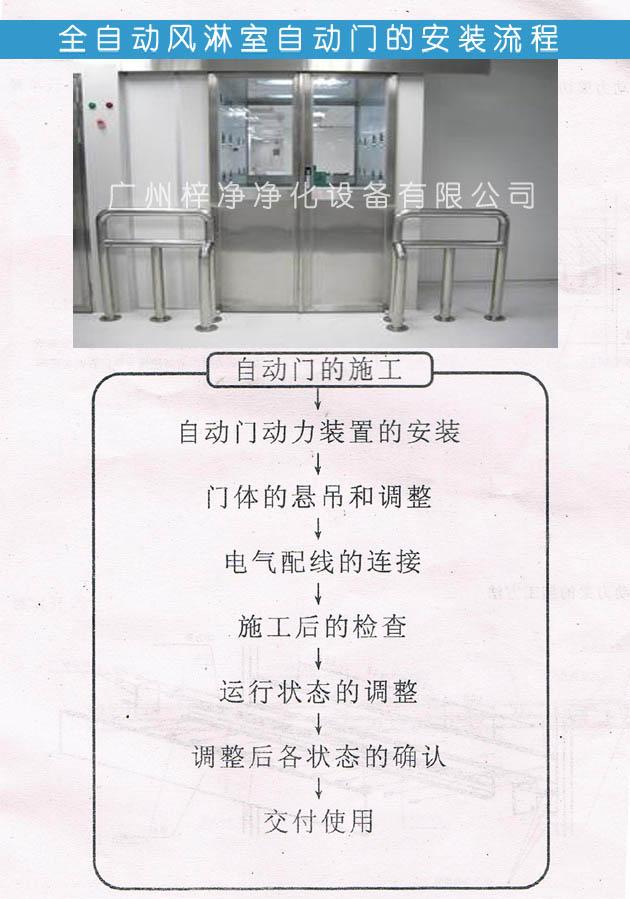 風(fēng)淋室安裝>>自動門動力裝置的安裝>>門體的懸吊和調(diào)整>>電氣配線的連接>>施工后的檢查>>運(yùn)行狀態(tài)的調(diào)整>>調(diào)整后各狀態(tài)的確認(rèn)>>交付使用。
